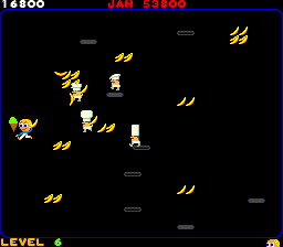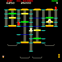![]() | Burgertime (1982) | A rather unique concept, in which you (as the cook), try to assemble gigantic burgers, while trying to dodge other types of food that are trying to kill you. By running completely over a burger ingredient, you cause it to fall to the next level, and eventually you get all the pieces together to make a complete burger. You also have limited Pepper spray to scare the pickles, eggs, etc. off. |