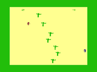 ![]() | Droid War (1983) | Also requiring two players simultaneously to shoot each other. Instead of wagons, etc. travelling up the middle to block shots, you have a yellow wall scrolling up that you have to shoot through. An added feature is that the player is guarding 8 droids behind them and the aim of the player is kill all 8. The players can not shoot each other directly; you win by killing the droids. This was originally a type in game for the Dragon 32 in Personal Computer News magazine (September 15-21, 1983) in the UK. |